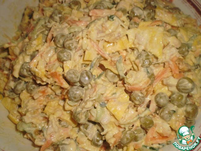 Все ингредиенты для салата хорошо перемешиваем. Перед подачей на стол добавляем майонез или сметану. По желаю можно посыпать рубленой зеленью.