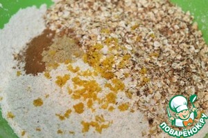 Смешиваем муку, хлопья, соль, корицу, имбирь, мускатный орех, ванилин и цедру.