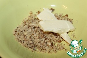 В отдельной миске смешиваем сливочное масло комнатной температуры с измельчённым грецким орехом.