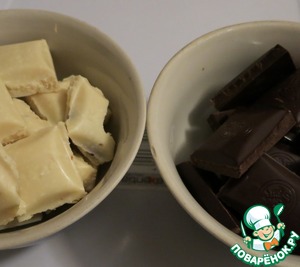 Шоколад поломать на кусочки и растопить в микроволновке или на паровой бане (1 белую и 1 темную шоколадку).