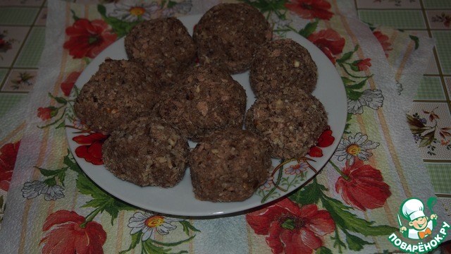 • Сформировать из теста небольшие круглые шарики, внутрь каждого добавить по вишенке. Полученные печенюшки обвалять в измельченных грецких орешках и вафлях. Дать немного постоять (можно в холодильнике).