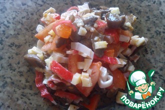 Лук нарезаем мелким кубиком, грибы пластинками, на минимальном количестве масла обжариваем лук, затем добавляем грибы. Солим, перчим по вкусу. Если масла получилось много, то сливаем излишки.