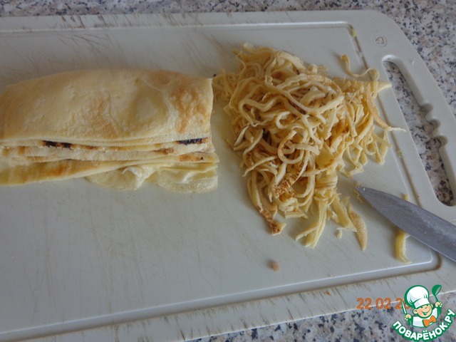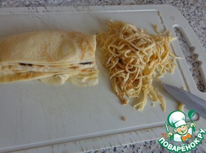 Нарезаем блинчики очень тоненькой соломкой.
