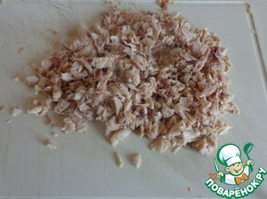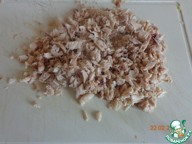 Курицу мелко режем, либо рвем руками на волокна.