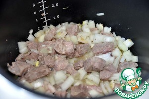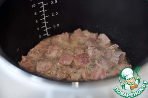 Когда масло нагреется, загружаем в чашу порезанное мясо и обжариваем около 5 минут при открытой крышке, помешивая лопаткой.