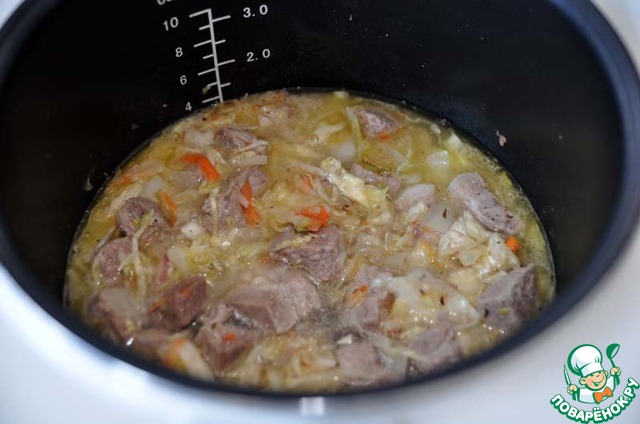Перемешиваем и добавляем 2 мультистакана воды или бульона.