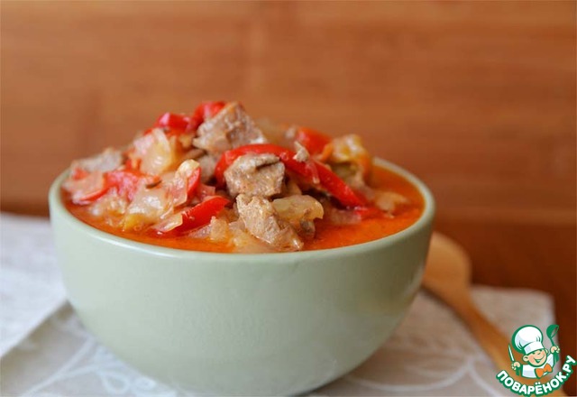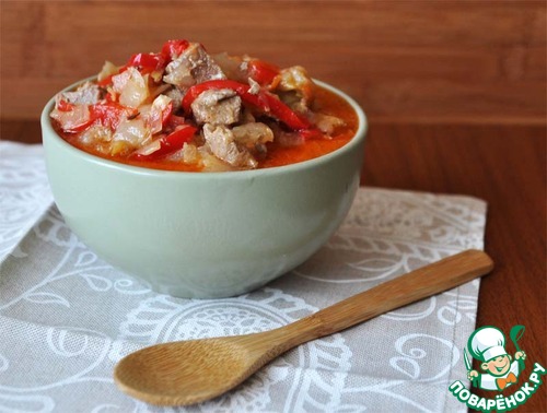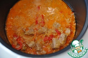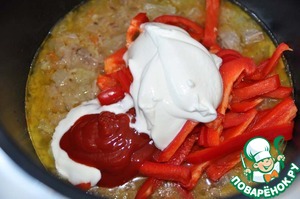 После звукового сигнала добавляем в гуляш болгарский перец, томатную пасту и сметану.