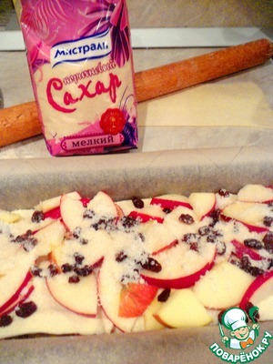 • На нее положить часть нарезанных яблок, 1 ст. л. изюма, 1 ст. л. коричневого сахара ТМ "Мистраль" (я использую мелкий, т. к. он точно в выпечке всегда растворяется, а вкус имеет карамельный),