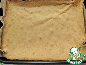 Выпекать в предварительно разогретой духовке при 200 °С 30-35 минут. Готовность проверить лучиной. Дать бисквиту остыть.