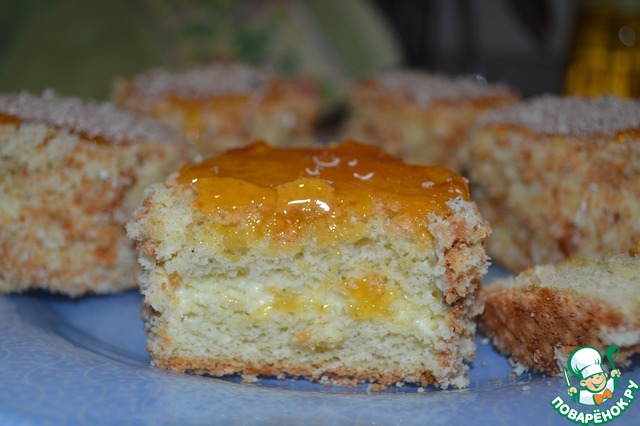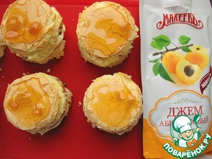 Сверху накрыть второй частью бисквита и выложить абрикосовый джем "Махеевъ". Джем придает нашим пирожным изысканный, фруктовый вкус.