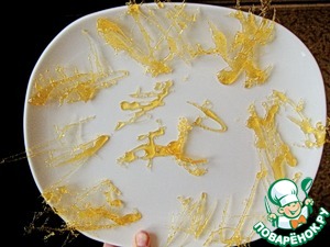 Для ее приготовления нужно 100 г сахара полностью растворить в 5 столовых ложках кипящей воды. Затем, не мешая и не накрывая крышкой, варить смесь до тех пор, пока не испарится половина воды, а сироп не приобретет характерный цвет. Карамель не должна быть слишком темной, иначе она будет горчить. Чтобы убедиться в правильности оттенка, немного карамели капают на белую тарелку. Карамель с интенсивной медовой окраской снять с огня и ложкой быстро нанести на промасленный пергамент или силиконовый коврик. -