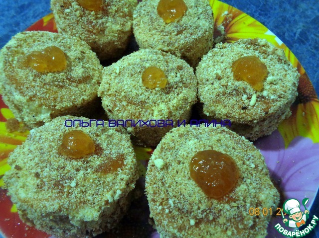 Затем обмазать кремом боковые стороны пирожных и обвалять в бисквитной крошке. (Может быть, кому-то будет удобнее сначала нанести крем и крошку, а потом выложить джем - смотрите по себе) Готовое пирожное поставить на 2-3 часа в холодильник.