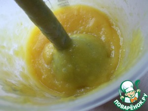 Кусочки манго, 1 ст. л. лимонной цедры, 40 г сахара, пюрируем с помощью погружного блендера в однородную шёлковую массу.