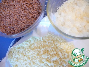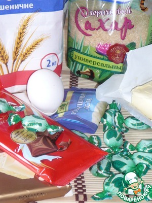 • Пока корж запекается, измельчаем шоколад (я натерла) и конфетки ( прямо в фантиках разбила на осколки молоточком для мяса).