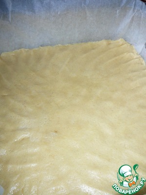 • Можно отправить тесто в холодильник, чтобы пристыло, а можно мокрыми руками распределить его по форме (или просто на пергаменте). У меня квадратная форма (24 см сторона). Отправляем тесто в духовку на 20-30 минут при Т 220С. Это для моей духовки. Вы ориентируйтесь по своей. Готовность проверяем палочкой.