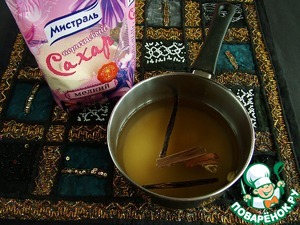 Пока слойки пекутся, готовим сироп для пропитки. Для приготовления восточных сладостей часто используют мед, но мёд при нагревании теряет свои полезные свойства и становится вредным. Поэтому я рекомендую ароматный тростниковый сахар Мистраль. Берем равное количество сахара и воды (по объему), палочку корицы, несколько коробочек кардамона и половинку стручка ванили, можно уже вычищенного.