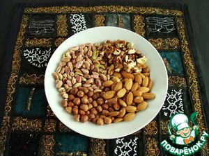 Я взяла те орехи, которые у меня были: фисташки, миндаль, фундук и грецкие. Можно брать любую смесь на ваш вкус или готовить с каким-то одним видом орешков. У меня было 200 г орехов, этого более чем достаточно на 400-граммовую пачку теста. Можно и немного меньше - 120-150 г. Тогда выпечка будет более воздушной, потому что все же орехи поддавливают тесто при выпечке. Но я люблю орехи, поэтому беру побольше. -