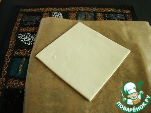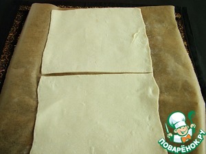 Теперь займёмся тестом. Заранее размораживаем его по инструкции. Обычно в упаковке имеется 2 квадратных пласта теста.