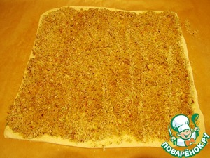 Берем один из квадратов, укладываем его на противень, застеленный бумагой для выпечки, и распределяем по нему одну третью часть молотых орехов. Накрываем вторым квадратом и повторяем с орехами. -