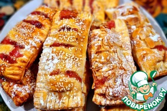 Выпекаем слойки 15 минут при 190*С до хорошего зарумянивания. Разрезаем на порции, если не разрезали перед выпечкой.