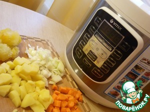 Через час закладываете в чашу мультиварки нарезанные средним кубиком картофель, морковь, лук и тыкву, а также измельченный чеснок. Солите и перчите по вкусу и занимаемся своими делами еще 55 минут!