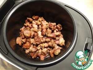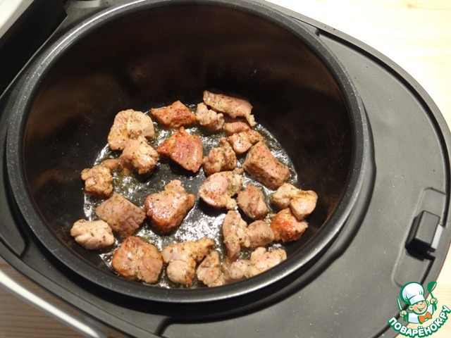 В чашу добавляю оставшееся оливковое масло и частями обжариваю мясо.