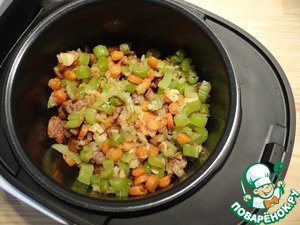 Мультиварку включаю на режим "Поджаривание" на 20 минут, наливаю половину оливкового масла, чуть нагреваю и обжариваю овощи, иногда помешивая их. Овощи вынимаю из чаши мультиварки.