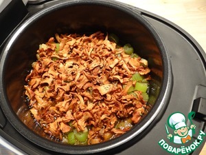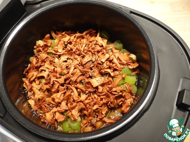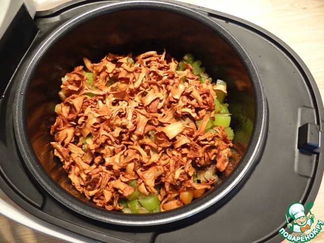 Это замечательное рагу я с легкостью приготовила в мультиварке Vitek VT-4205 ВК. Сначала замачиваю в теплой воде на несколько часов сухие грибы (у меня очень тонко нарезанные лисички).
