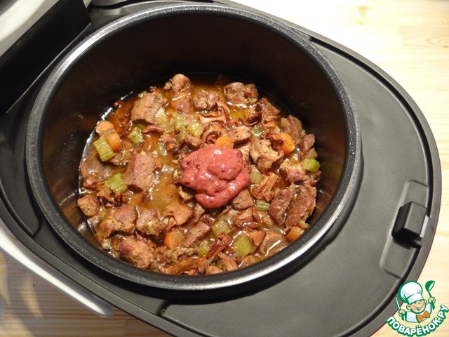 За 20 минут до готовности вливаю красное сухое вино и добавляю сливовый джем (в магазине я сливовый джем найти не смогла, но увидела замороженные половинки слив, из них получился восхитительный джем, а затем кусочки слив я измельчила с помощью блендера). Рагу аккуратно перемешиваю и продолжаю готовить при закрытой крышке мультиварки..