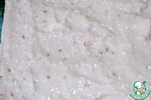 Для первого коржа смешаем часть творога с малиновым джемом.
