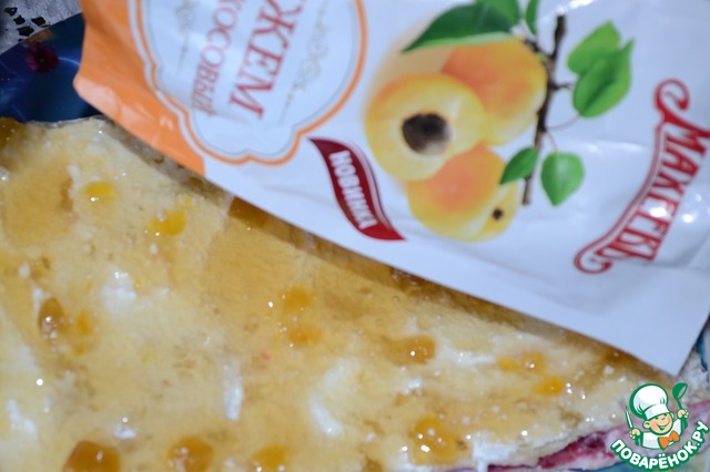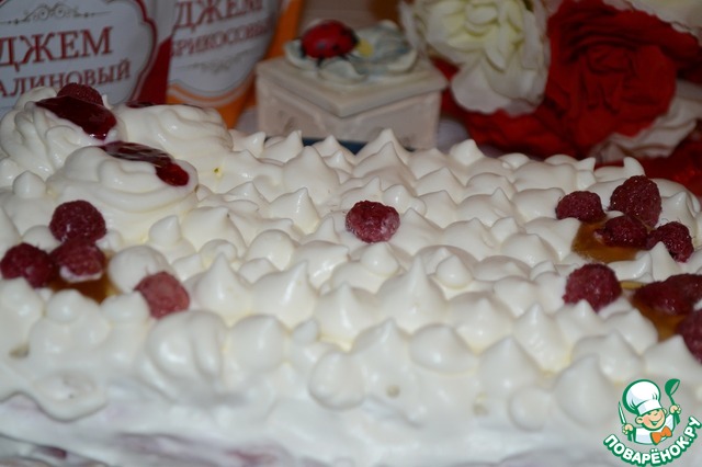 Предлагаю попробовать легкий, воздушный торт с творожным кремом под взбитыми сливками, с ароматом и вкусом малинового и абрикосового джемов.