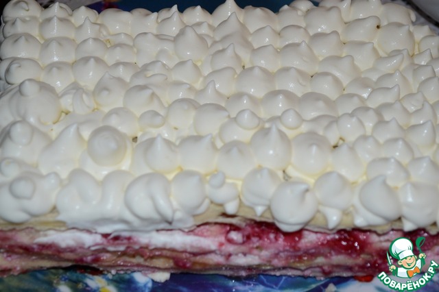 С помощью кондитерского шприца нанесла сливочные пики на верх торта, бока промазала взбитыми сливками. Украсила малинками. Торт на ночь оставить в холодильнике, чтобы лучше пропитался.