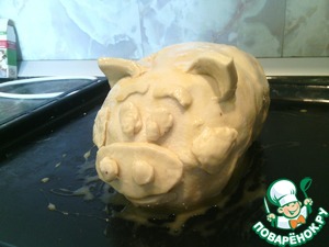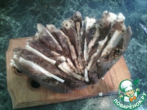 Сделать продольные надрезы и смазать чесноком протертым с солью и специями.