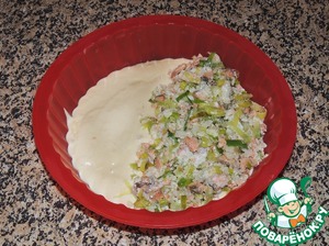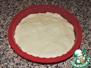В смазанную форму вылить половину теста, сверху выложить начинку.