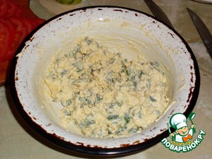 ... делаем начинку: трем на мелкой терке сыр, добавляем мелко нарезанную зелень, чеснок, выдавленный через пресс, и майонез.