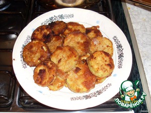 • Каждый кружок обмакиваем во взбитое яйцо, обваливаем в панировочных сухарях и обжариваем с 2-х сторон на сковороде.