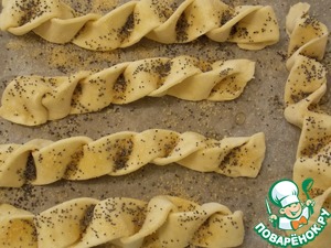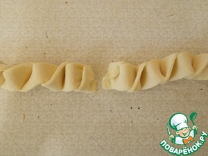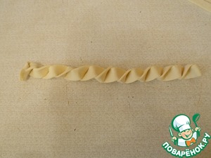 Тесто раскатать в одном направление в длинный пласт. Нарезать на полосы в длину, около 1 см. в ширину.