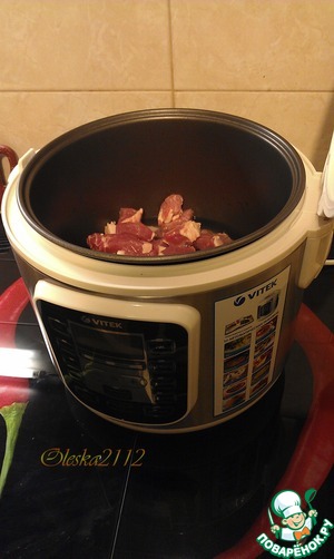 Выкладываем свинину в чашу мультиварки, наливаем воды на один палец ниже уровня мяса. Выставляем режим "Тушение", время 25-30 минут.