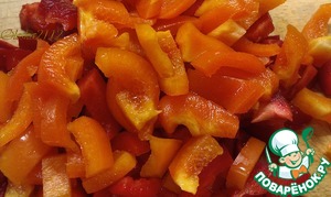Разноцветный перец режем кусочками и отправляем к моркови.