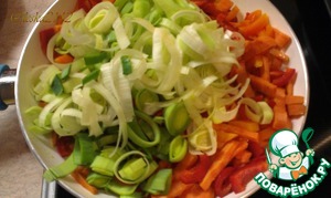 Режем лук-порей колечками и тоже выкладываем на сковороду. Пассеруем овощи.