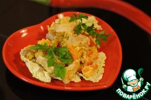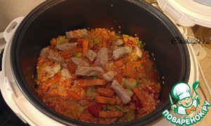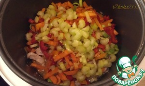 Выкладываем пассерованные овощи в чашу мультиварки к мясу и добавляем нарезанный кусочками сельдерей. Перчим.