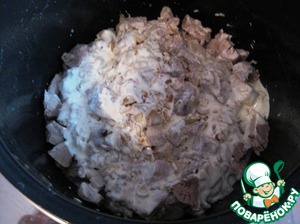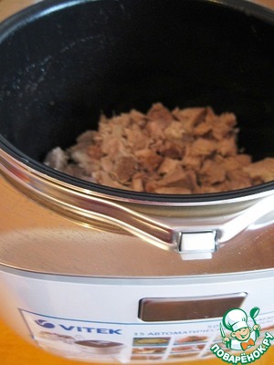 В чашу мультиварки положить мясо, разрезанное на мелкие кусочки,