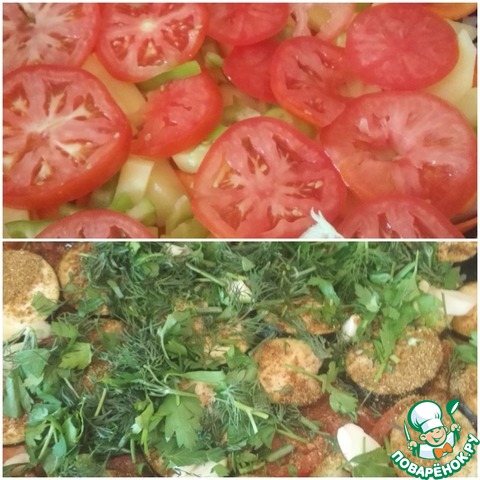 Баклажаны. Этот слой снова солим и сдабриваем специями. Выкладываем сверху кусочки чеснока.