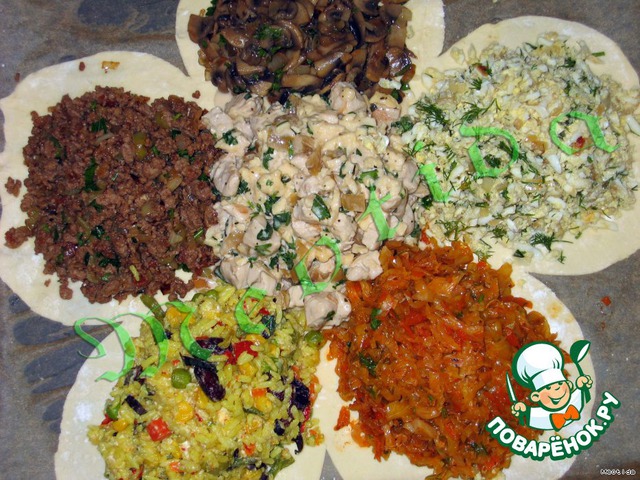 Ожидая гостей, вспомнила, что у всех свои пристрастия: кто-то не ест грибы, кто-то рыбу, кто-то не любит рис…поэтому вот такой цветок получился, у которого каждый лепесток и серединка с разной начинкой.. (в первой части все шаги не поместились)
