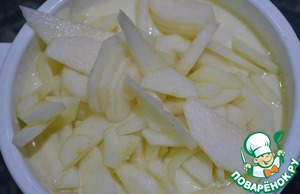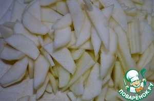 • Груши очистить от кожи и семян и нарезать тонкими пластинками.