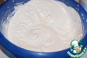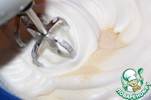 В три приема ввести сахарную пудру взбивая на 1-й скорости миксера. Меренга должна быть гладкой и блестящей.