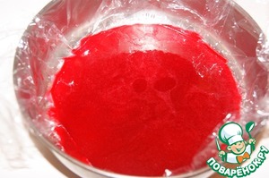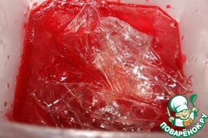 Смешать желатиновую смесь с остальным пюре и вылить его в форму 18 см в диаметре застеленную пищевой пленкой. Поместить в холодильник и дать застыть, а потом заморозить прямо в форме.