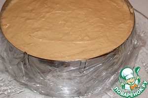 Накрыть торт пищевой пленкой, чтобы она не касалась мусса и поместить в холодильник до полного застывания мусса.