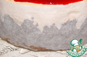 Подрезав бока по окружности освободить торт от кулинарного кольца. Поместить в холодильник.