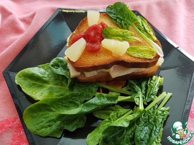 Каждый сандвич украсить 1 /4 частью ломтика ананаса, зеленью и маленькой горкой томат-пасты.